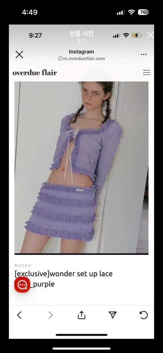 カーディガンとフリルのディテールが施されたミニスカートの組み合わせです。色はかすかな紫色です。