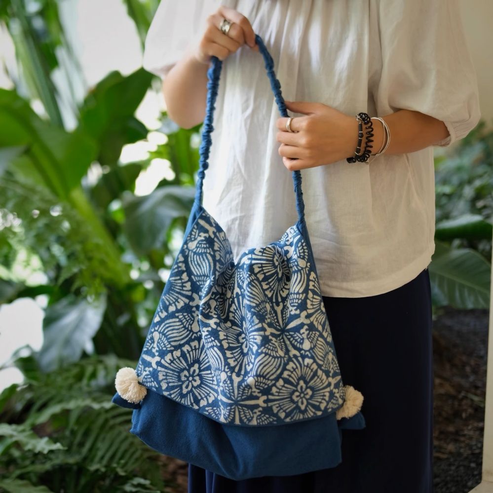 SGYP 176 藍染 型染 四方花鳥模様 フラップショルダーバッグ 手染め植物染め 綿布 大容量 レトロデザイン オリジナル一点物