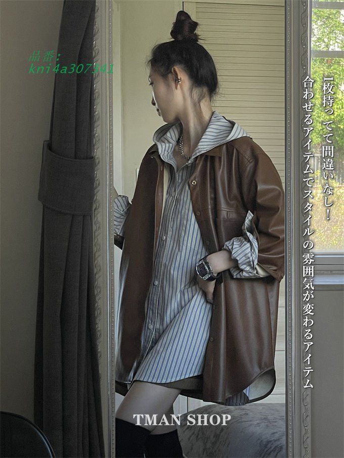 ライダースジャケット レディース レザージャケット 革ジャン 皮ジャン シャツブラウス 羽織り シングル ジャンバー アウター 長袖 ストライプシャツ kni 4 a 307341