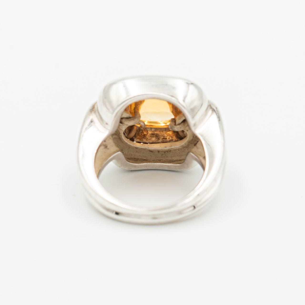 蜂蜜色のシトリンを18Kのベゼルで抱え、土台には端正なスターリングシルバーを用いた二層構成が、色と質感のコントラストを美しく際立たせます。