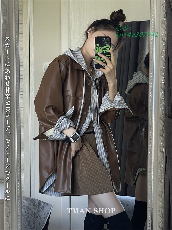 ライダースジャケット レディース レザージャケット 革ジャン 皮ジャン シャツブラウス 羽織り シングル ジャンバー アウター 長袖 ストライプシャツ kni 4 a 307341