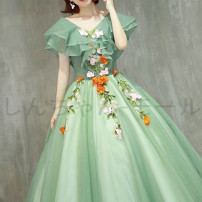 カラードレス 編み上げ グリーン 半袖 緑 ロングドレス 結婚式 二次会 発表会 演奏会 ウェディングドレス ウエディングドレス 花嫁 前撮り