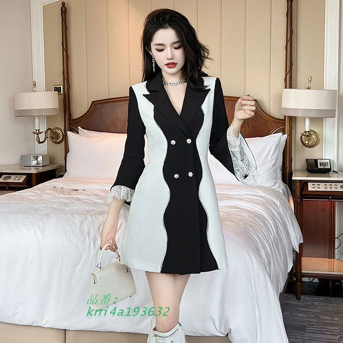 大きめ襟付き 2連前ボタン ベルスリーブ裾レース ショートスーツワンピース 黒 スーツワンピース おしゃれ 韓国 kni 4 a 193632