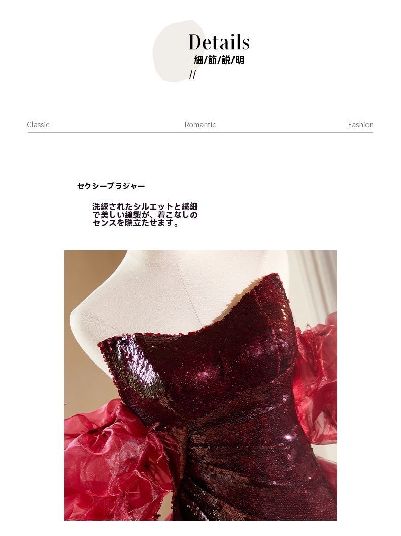 華やかで高級感あふれるワインレッドのロングドレスでございます。抹胸(チューブトップ)デザインとノースリーブ仕様により、デコルテラインを美しく演出し、フィッシュテールのスカートが上品なシルエットを作り出します。スパンコールの輝きが光を受けて華やかさを引き立て、新婦や披露宴、宴会、パーティー、舞台など、特別なシーンに最適でございます。