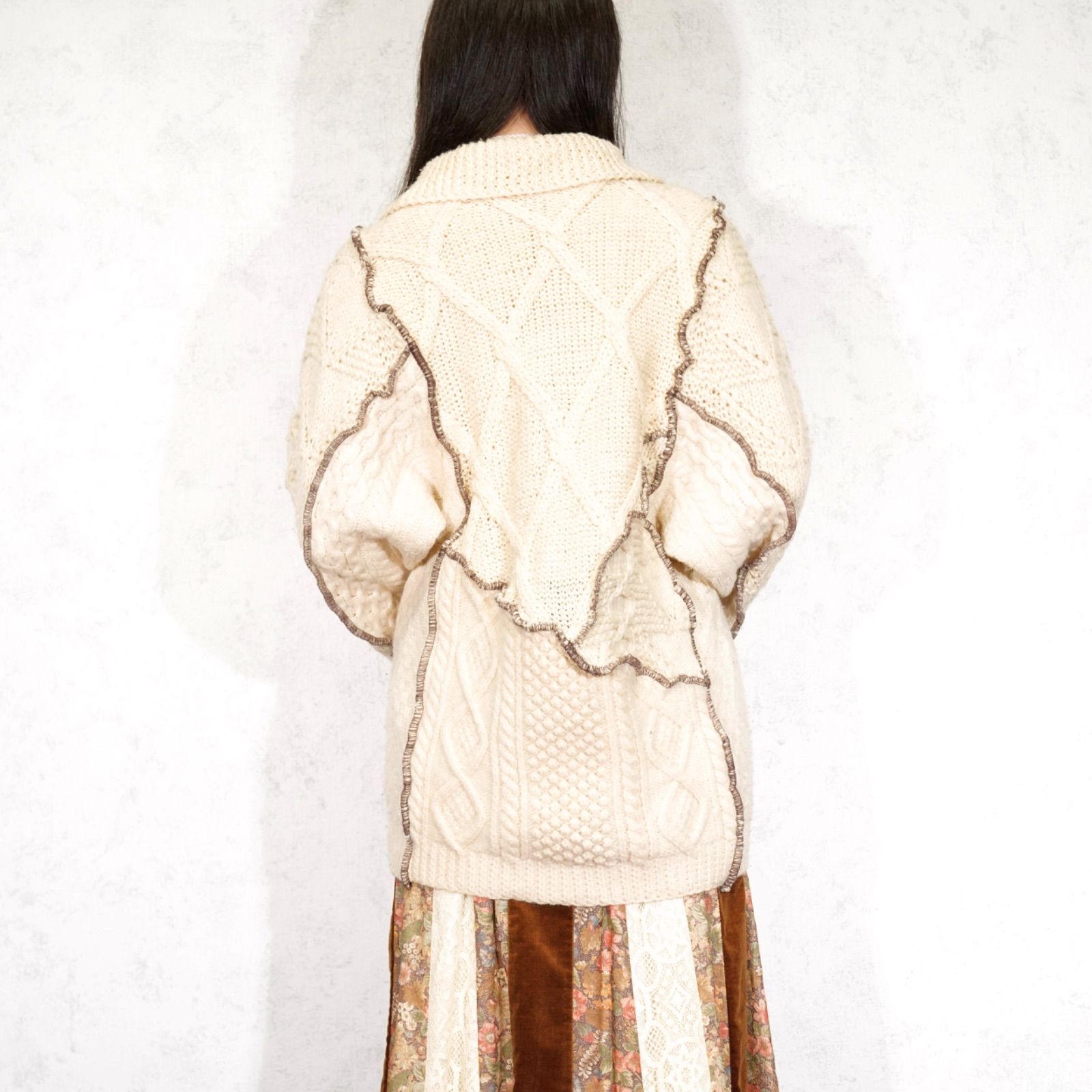 EU VINTAGE COLLAR DESIGN PATCHWORK REMAKE CABLE KNIT CARDIGAN|ヨーロッパ古着襟付きデザインパッチワークリメイクケーブルニットカーディガン ニットジャケット フィッシャーマンセーター|アランニット