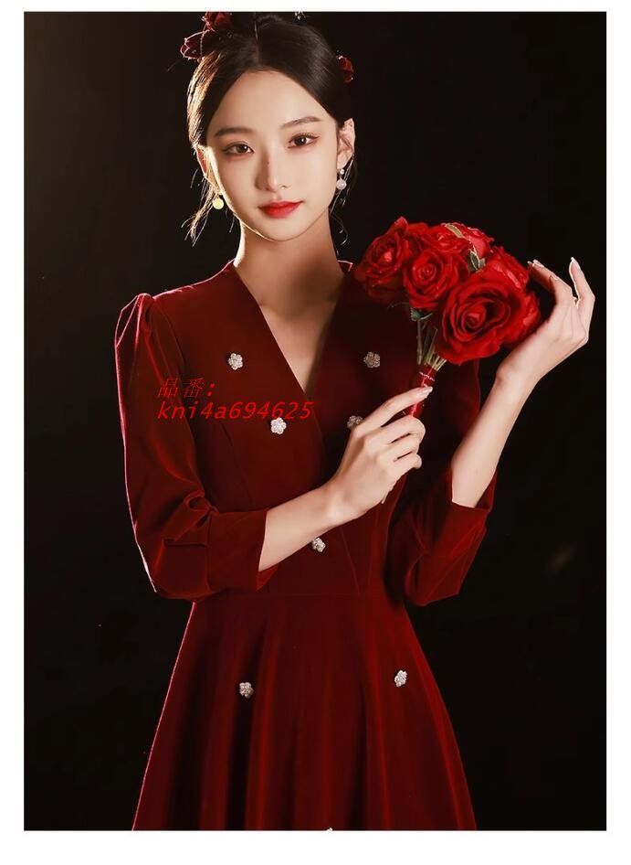 イブニングドレス ワイン赤 ベロア ロング丈 Vネック ラインストーン 結婚式ドレス 長袖 パーティードレス お呼ばれドレス 発表会ドレス kni 4 a 694625
