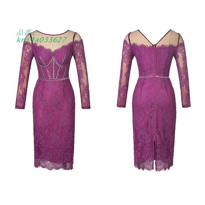 シースルーショルダー 総レース刺繍 膝丈タイト長袖ワンピース 紫 キャバ スナック レディース ドレス 韓国 パーティー 服 kni 4 a 033627