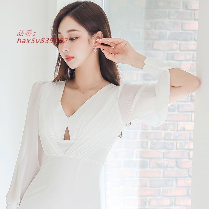 胸元Vネック開き ハイエスト膝丈タイト長袖ワンピース 白 青 セクシー タイト 胸開き キャバ 韓国 スナック ドレス hax 5 v 839662