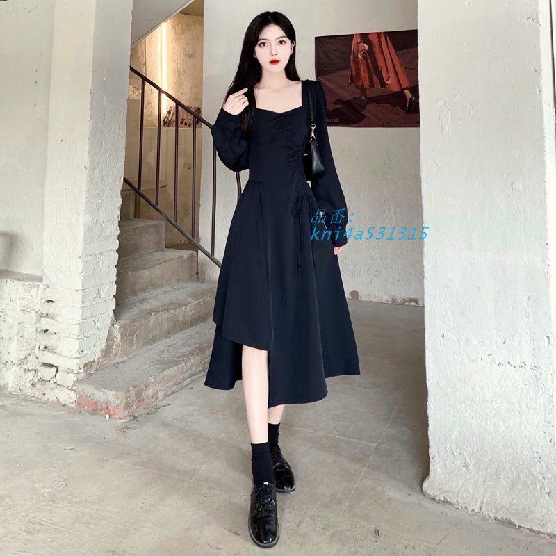 大きいサイズ M-5 L 2点セット ワンピース+レザー風キャミベスト 長袖 スクエアネック 202111 おでかけ アシンメト膝丈 202112 kni 4 a 531315