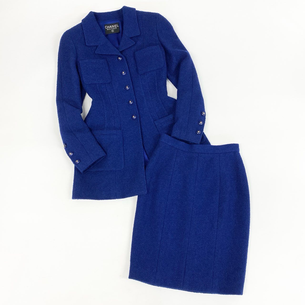 シャネルのラグジュアリーな雰囲気を纏ったセットアップスカートです。カラーは深みのあるロイヤルブルーで、上質なウールツイード素材がマットな質感と立体的な風合いを演出。フロントや袖口にあしらわれたメタルボタンがクラシカルなアクセントとなっています。ジャケットはヒップをカバーし、スカートはひざ丈で端正な印象を与え、ビジネスや式典、特別なお出かけに最適。永くご愛用いただける、洗練された一着です。