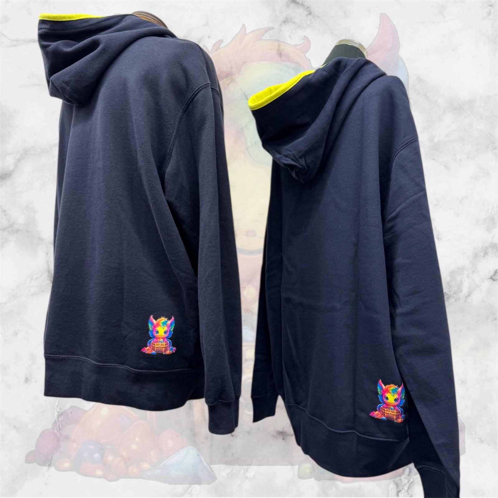 ネイビーのボディに鮮やかなイエローのフード裏地と、グリッターゴールドのロゴが映えるパーカーです。