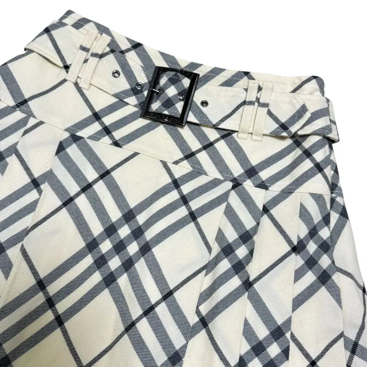 クリーム色とチャコールカラーが適度に混ざり合った商品で、バーバリーならではのすっきりとしたプリーツフィットと希少なベルトのディテールでコレクション価値も十分ある商品です ⭐️