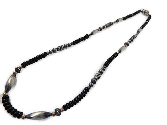 オニキスを中心に様々な形、大きさのナバホパールシルバービーズ、14金GFビーズ(ゴールドフィールド)を使用したカスタムネックレスになります。