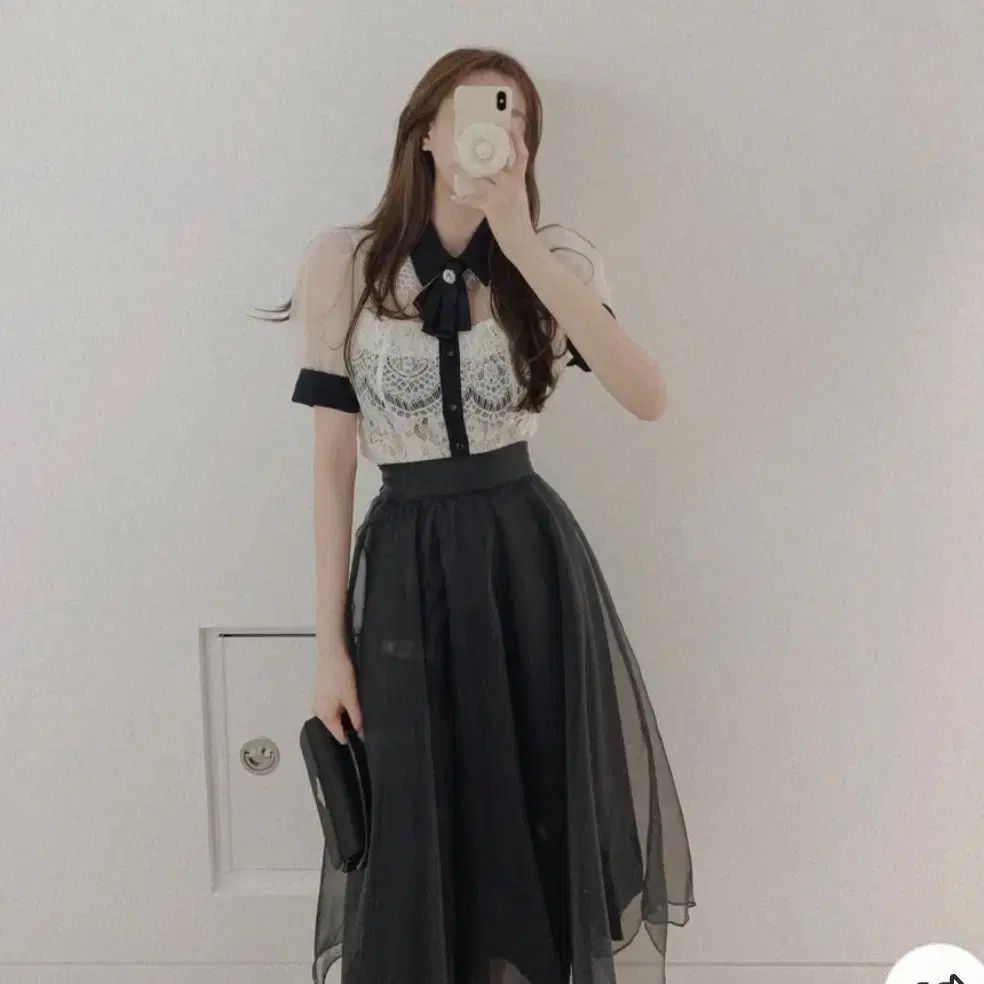 これはDelisomのツーピースセットアップです。レースブラウスと黒のスカートの組み合わせは豪華です。デートルックにもゲストルックにもピッタリだと思います。ご不明な点がなければ、すぐに安心してお支払いいただけます!