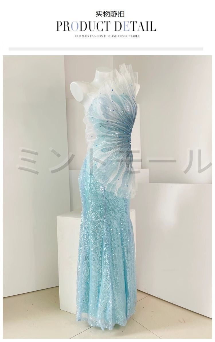 こちらのロングドレスは、人魚姫をイメージした繊細なグラデーションが特徴で、通常の光線下ではブルーグリーン系の上品なカラーとしてご覧いただけます。きらめくスパンコール生地と立体感のあるチュールのコンビネーションで、動くたびに華やかさを放つ大人の女性にふさわしい一着。