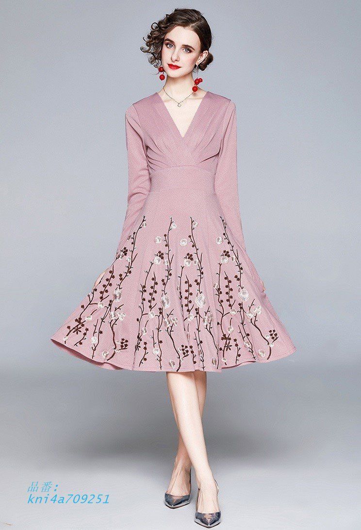 新着 ワンピース M-3 L 花柄刺しゅう 上品 Vネック 長袖 膝上丈 2次会 202111 ウエストリボン パーティ 202112 通勤 結婚式 おでかけ kni 4 a 709251