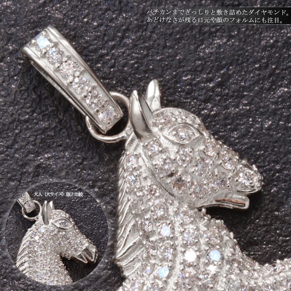 18金ホワイトゴールドを使ったダイヤモンドペンダントトップです。馬モチーフにダイヤモンドを敷き詰めたデザイン。バチカン部分までぎっしりと敷き詰めたダイヤモンドは全石無色透明で良質な輝きのルースを厳選。ふっくらとした胴体、躍動感のある前足や尾の滑らかな曲線まで丁寧に表現し力強さと可愛らしさを併せ持ったホースモチーフに仕上がりました。こちらは愛らしいフォルムが強調された仔馬版となります。
