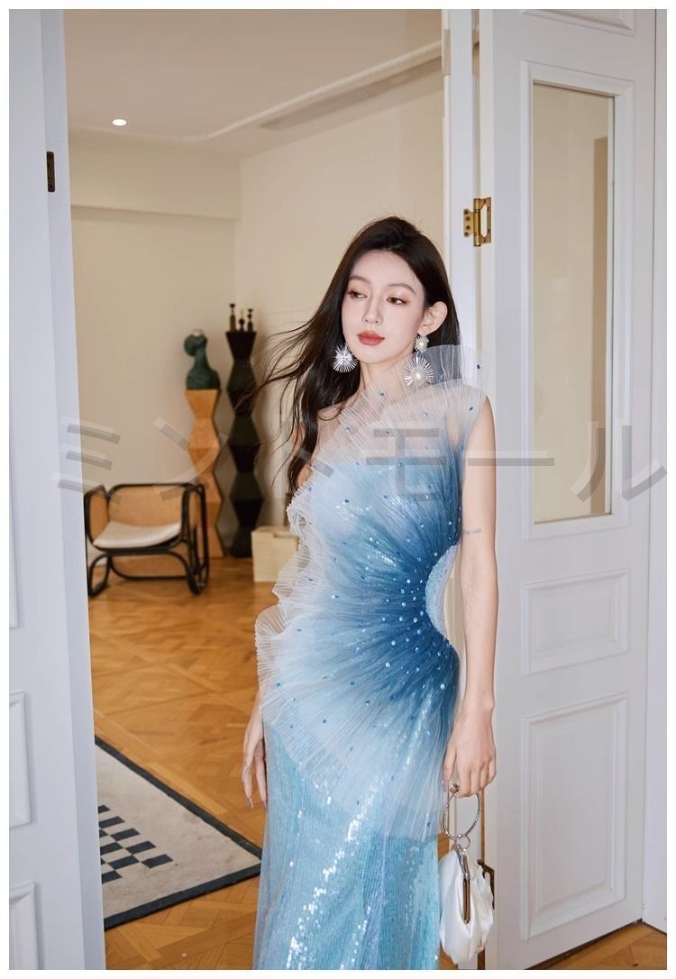 こちらのロングドレスは、人魚姫をイメージした繊細なグラデーションが特徴で、通常の光線下ではブルーグリーン系の上品なカラーとしてご覧いただけます。きらめくスパンコール生地と立体感のあるチュールのコンビネーションで、動くたびに華やかさを放つ大人の女性にふさわしい一着。