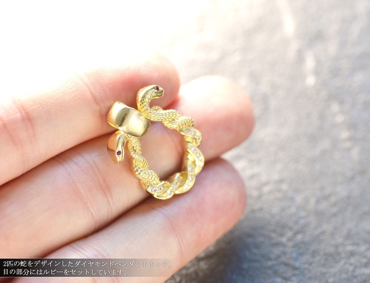 18金を使ったスネークモチーフペンダントトップです。2匹の蛇が絡み合う様子を細部まで丁寧に表現したお勧めデザイン。蛇らしい曲線を描くフォルムや鱗の細やかさは思わず見入ってしまう程。両目にセットしたルビーと胴体に散りばめたダイヤモンドが質感を高め力強さと品を兼ね備えたペンダントトップに仕上がりました。装着すると胸元で程よい存在感を感じ遠目には馬蹄のようなフォルムを描くデザイン。軽量で普段使いに最適です。