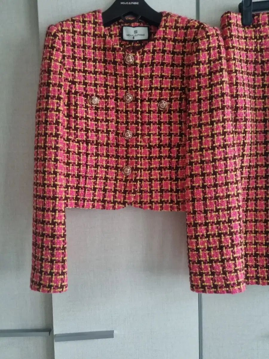 、ダークピンクカラーとゴールドのボタンが高級感があります。チェック柄のディテールが洗練された印象を演出します。