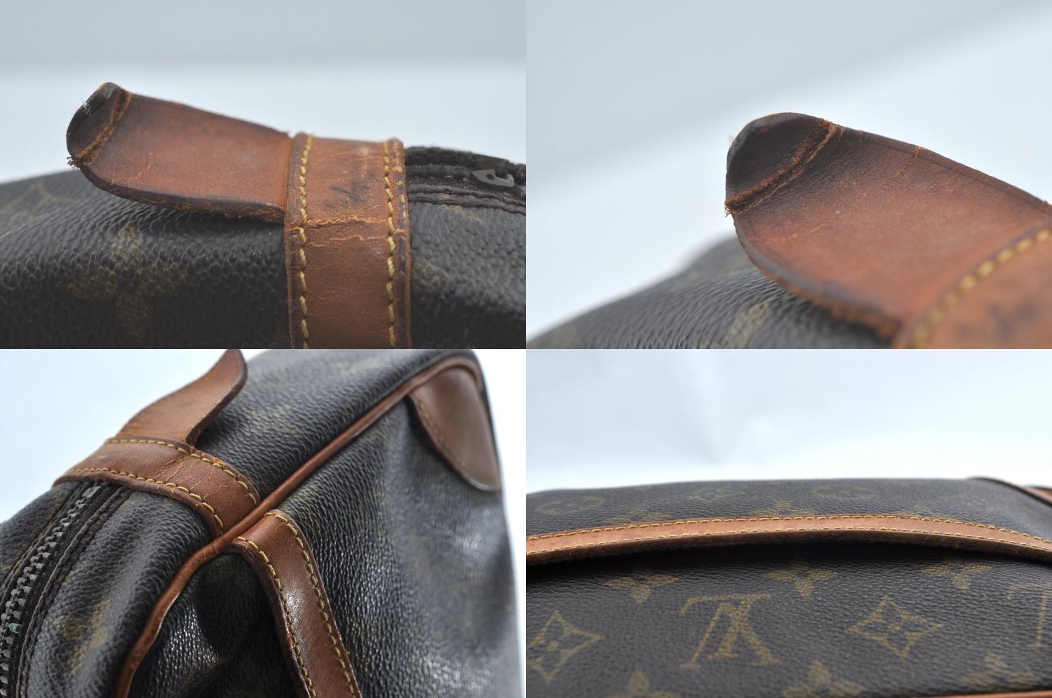 【その他状態】外側と内側のポケットに剥がれがあります。バッグ内側に汚れやペン跡があります。外側の革部分が破れています。