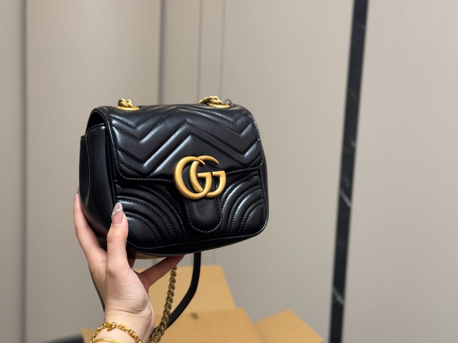 グッチ「GG Marmont スクエアファット」が、高級感あふれるフォームで登場!サイズ 18×16cm のボックス型デザインに、本格的な 1 層羊皮革を使用した柔らかい質感が特徴的です。GG ロゴのメタルアクセントとダイヤモンドステッチがヴィンテージな雰囲気を演出し、軽量で使い勝手の良いバランス感が魅力的です。内部には小物収納スペースが配慮されており、コスパの高い実用派バッグとして大人気の 1 点です。グッチならではのクオリティを、ぜひこの機会に実感してみてはいかがでしょうか?