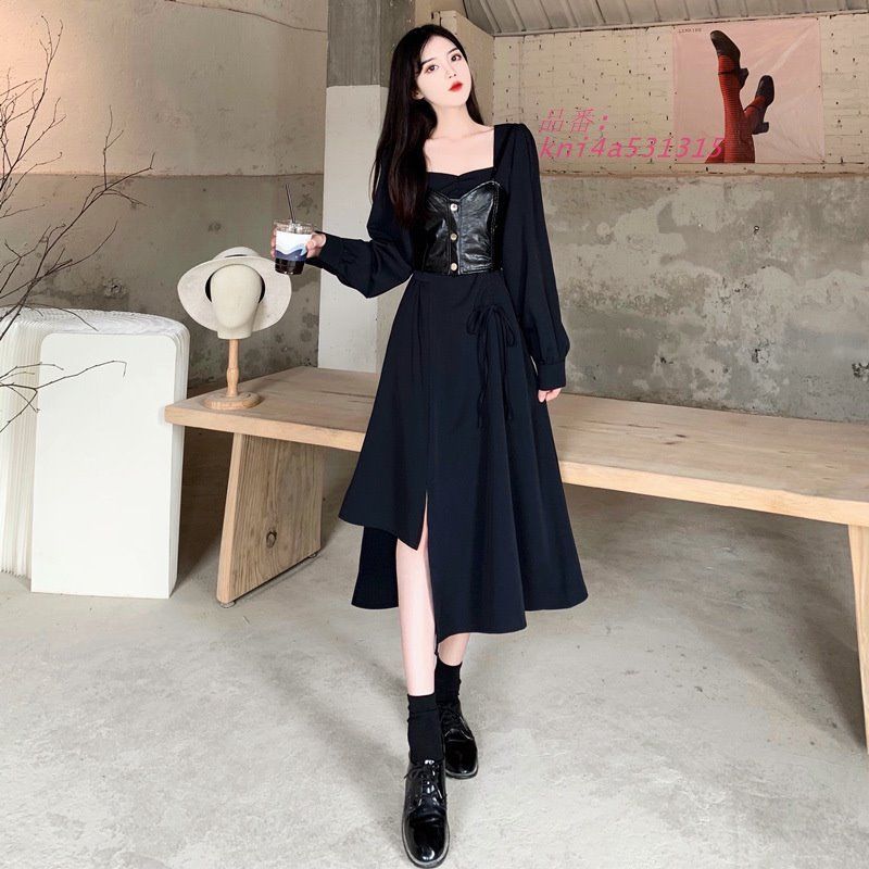 大きいサイズ M-5 L 2点セット ワンピース+レザー風キャミベスト 長袖 スクエアネック 202111 おでかけ アシンメト膝丈 202112 kni 4 a 531315