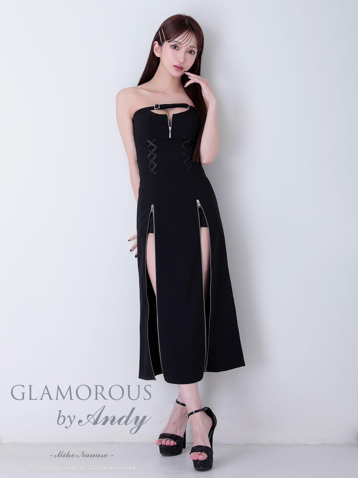 Mブラック GMS-V 892 GLAMOROUS by Andy | グラマラスバイアンディ ストレッチ| バストカット| ベルト| ジッパー| 編み上げ| リボン| ベア| 裾ジップ| スリット| フ ロングドレス| キャバドレス| ワンピース