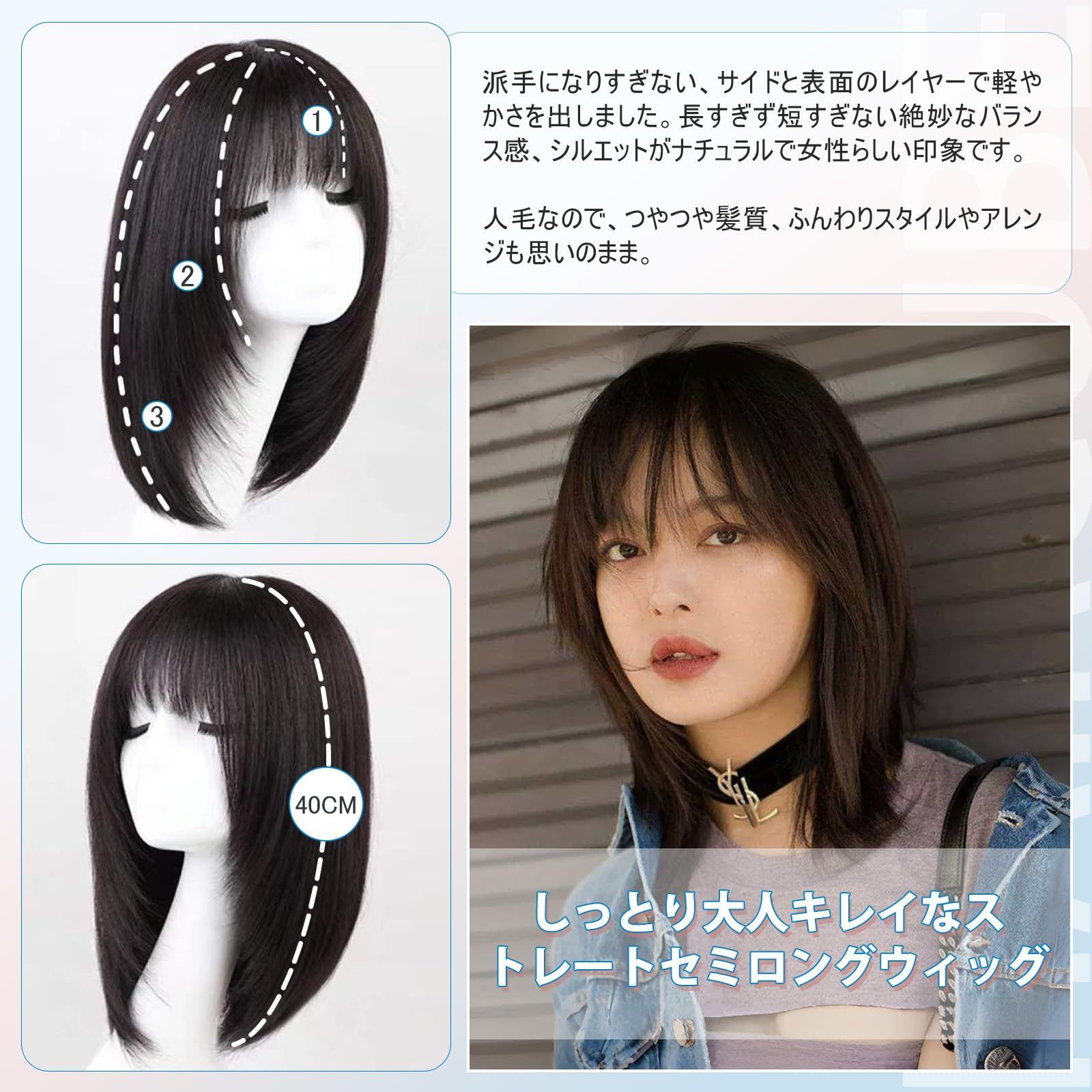 ぱっつん前髪 レディース フルウィッグ 軽い 手植え 耐熱 セミロング 人毛MIX 日常 人毛ウィッグ 医療用ウィッグ ブラウン HAIRCUBE