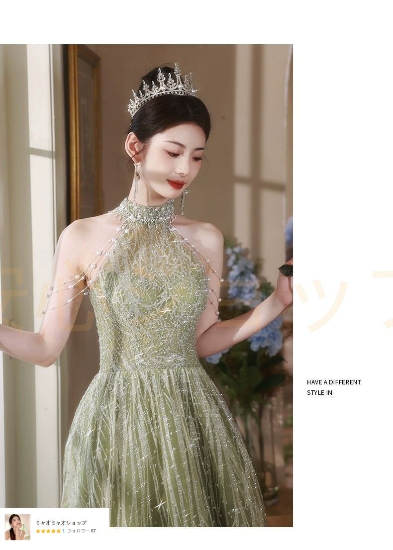 高級感あふれる果実のようなグリーンカラーのホルターネックロングドレスです。メイン素材は高品質な酢酸繊維とポリエステルを使用し、軽やかでしなやかな着心地。