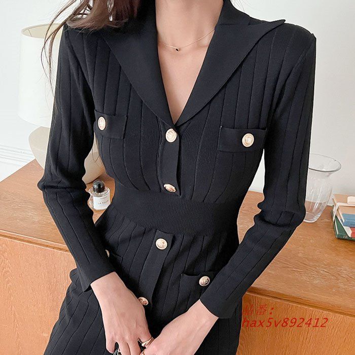 Vネック胸元 前ボタン長袖ショートタイトニットワンピース 黒 カジュアル タイトニット タイトミニ セクシー 韓国 hax 5 v 892412