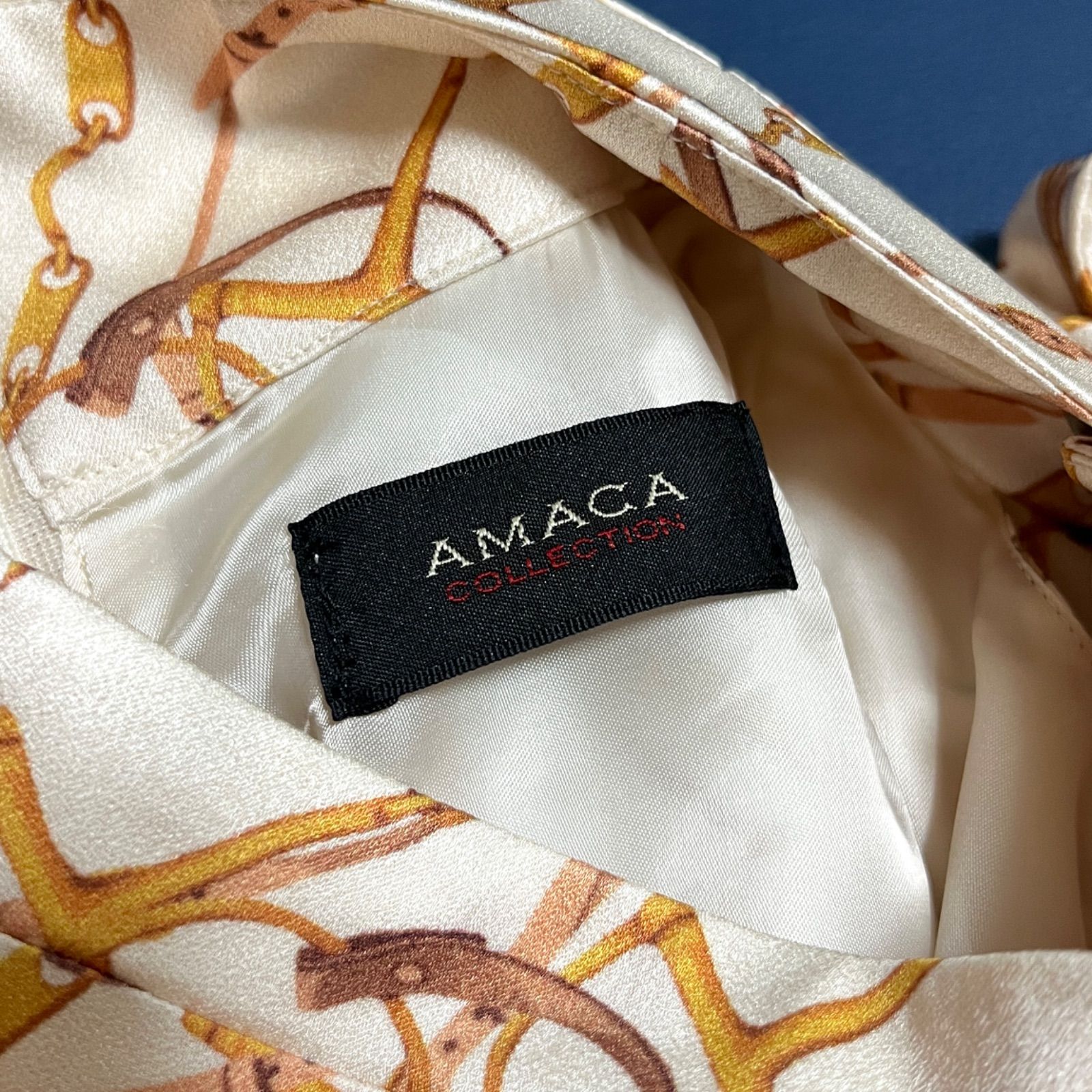 ci 75 AMACA 定価5.4万 チェーン柄ボウタイロングワンピース サテン 総柄 シャツワンピース 定価53 900円
