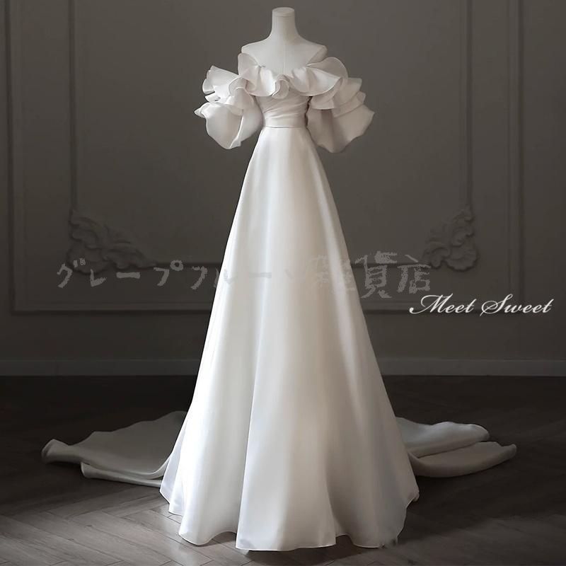 4 way ウェディングドレス ウエディングドレス 付け袖 二次会 結婚式 披露宴 前撮り 袖あり ロングドレス 花嫁 Aラインドレス サテン ビスチ