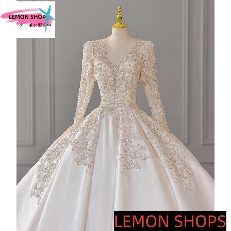 ♥ 2025 ウェディングドレス ロングドレス 結婚式 ウエディングドレス 長袖 Aラインドレス 二次会 花嫁 前撮り エレガント サテン ホワイト ビーズ ラメ刺繍 華やか 披露宴 LEMON