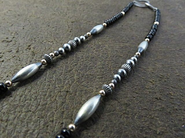 オニキスを中心に様々な形、大きさのナバホパールシルバービーズ、14金GFビーズ(ゴールドフィールド)を使用したカスタムネックレスになります。