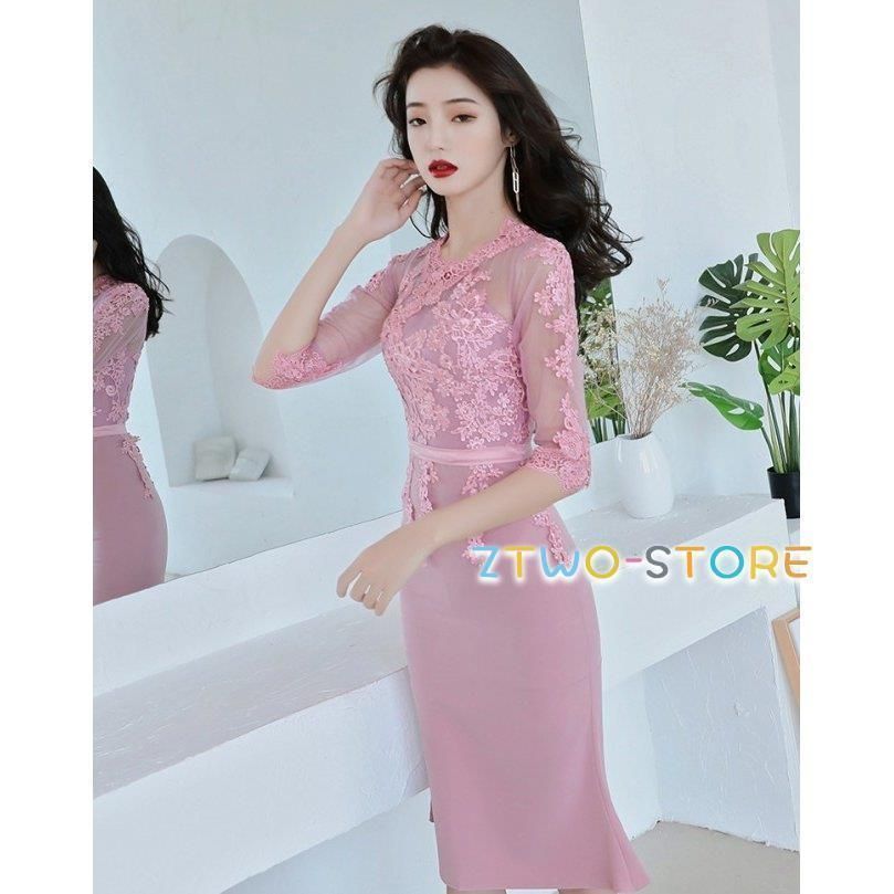 パーティードレス 結婚式 服装 お呼ばれドレス マーメイドドレス 花柄 レース シースルー 肌見せ 膝丈 袖あり 大きいサイズ 3L 4L 小さいサイズ ワンピースドレス マーメイドワンピース ウエストマーク 五分袖 刺繍 韓国 女性 おしゃれ 20代 30代