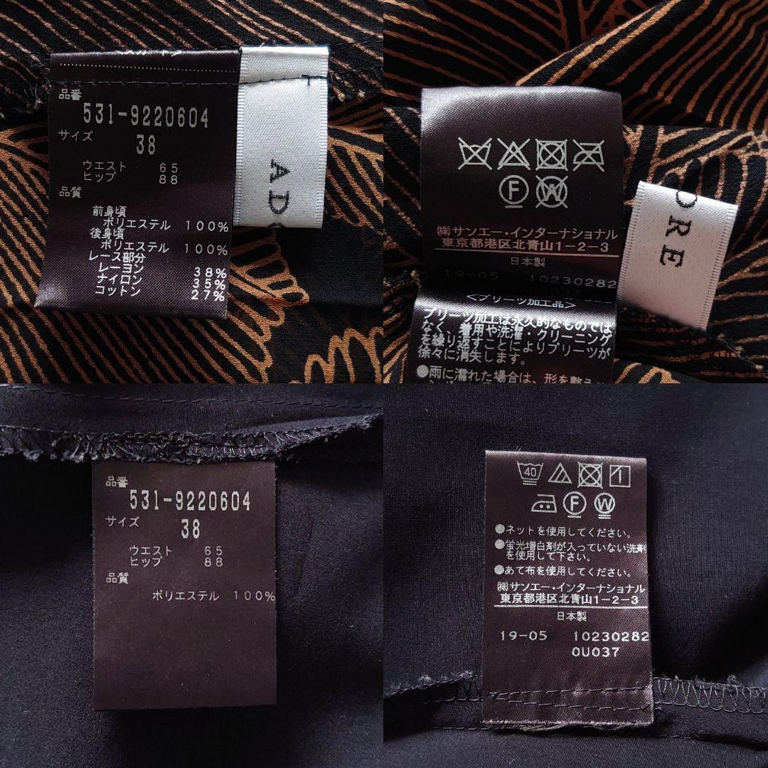 ADORE アドーア レイヤードプリントスカート プリーツ リーフ柄 ボタニカル 植物 花柄 総柄 レース ウエストゴム ブラウン×ブラック 茶×黒 フレア Aライン ロング マキシ丈 38 M ボトムス レディース