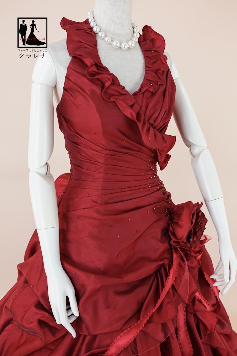 程よい光沢感のあるワインレッド色のポリエステルシャンタン地のカラードレス。