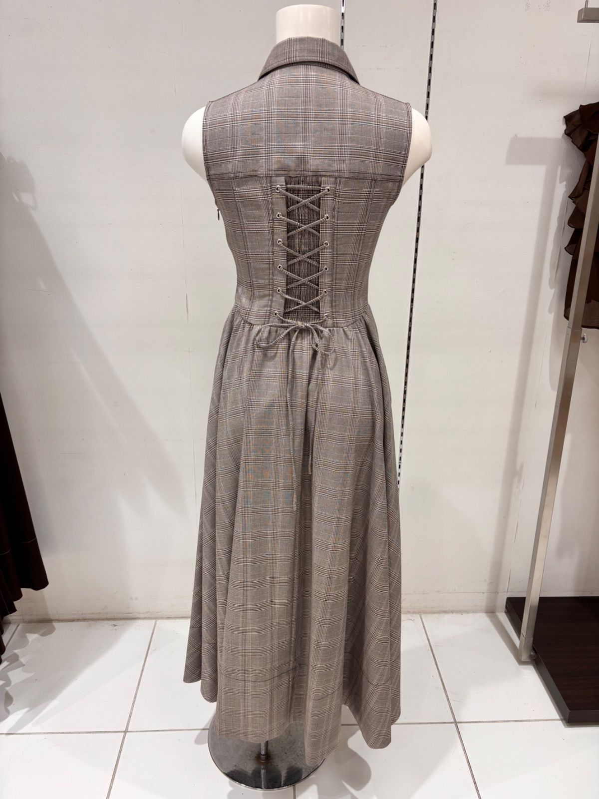 肩をすっきりと見せるノースリーブデザイン、襟付きシャツの洗練されたディテール、そしてウエストに向かってカーヴィーにフィットする計算された切り替え、ふんわりとしたレディなスカートが特徴?