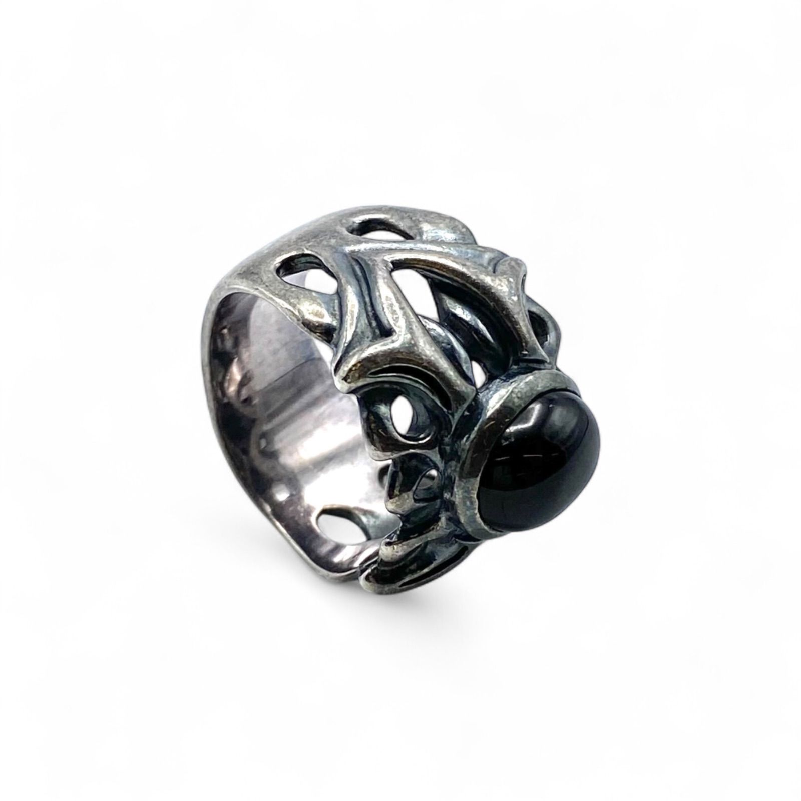 深い黒光りを放つオニキスを中央に配したシルバー925リング。周囲の透かし彫りが重厚感の中に軽やかさを与え、石の存在をより際立たせます。古くから魔除けや強さの象徴とされてきたオニキスが、独自のオーラを指先に宿す一点。