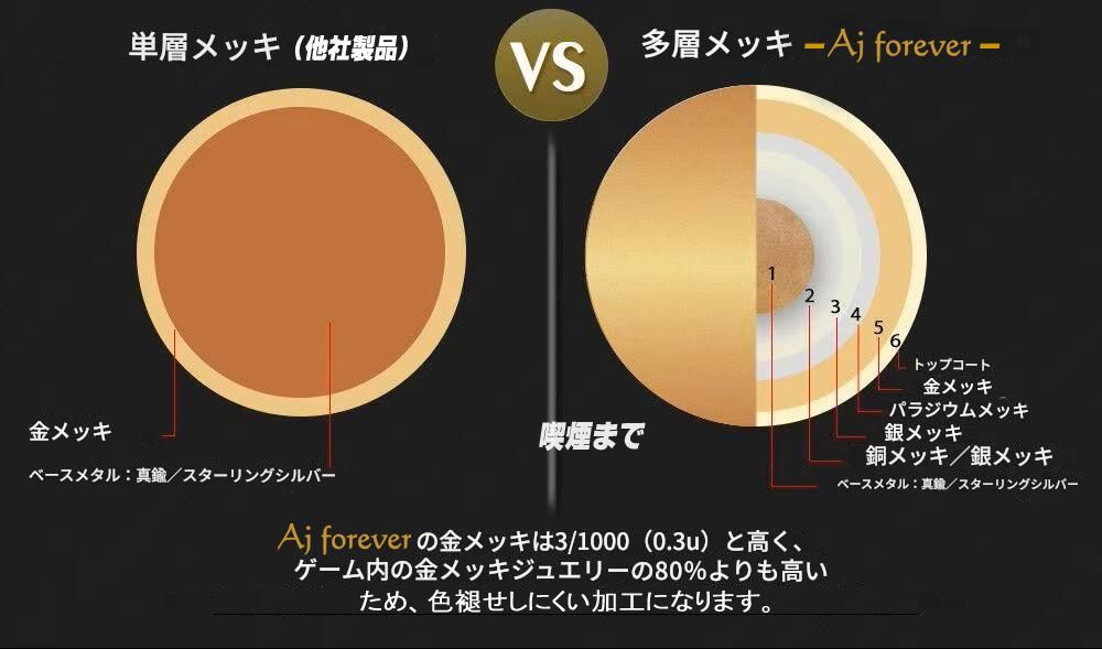 (メッキ加工は通常1~3層メッキですが、Ajブランドは5層メッキ加工しております。)