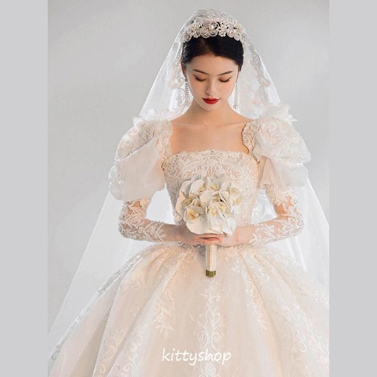 ウェディングドレス 袖あり 結婚式ドレス トレーンドレス ホワイトドレス 海外挙式 花嫁ドレス 長袖 パフスリーブ エレガント キレイめ