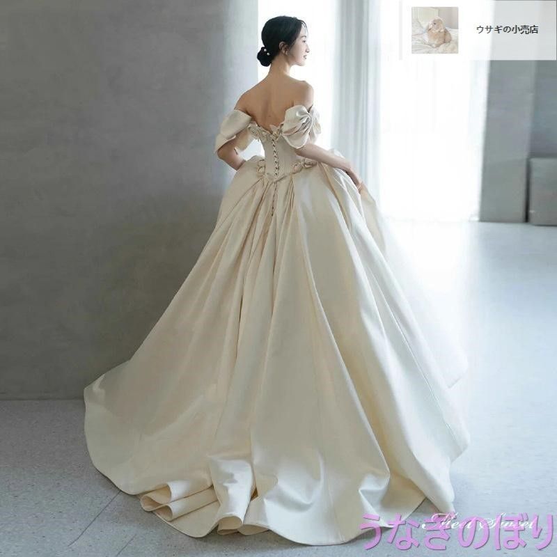 ウェディングドレス ウエディングドレス ロングドレス 二次会 結婚式 前撮り ブライダル 花嫁 オフショルダー リボン サテン 編み上げ プリンセスドレス