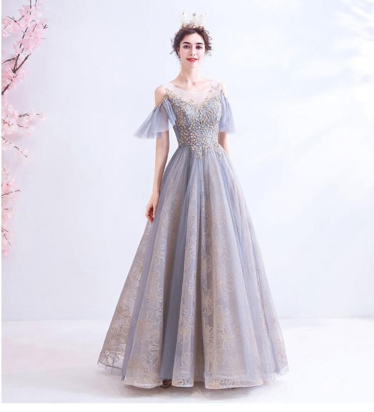 金糸刺繍とチュールのロングドレスです。ゴールドのサテン地にチュールを重ね全体的にフェミニンでエレガントな雰囲気に。上半身はチュールに金糸刺繍とビジューをあしらい、肩からチュールをふんわりとかけ、腕をカバーしています。下半身はチュールをたっぷりと使用しゴージャスでな印象に。パーティやイベント、結婚式など、様々なシーンで、気品のある印象を与えてくれる一枚です。裏地なし(チュールとサテンの2枚重ね)。背中編み紐掛け。ファスナ-なし。胸パット付。