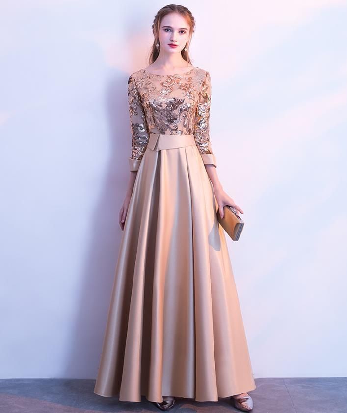 ゴールドスパンコ-ルイブニングロングドレスです。気品に満ちたとてもエレガントで上品なひとクラス上をいく一品です。トップス部分のレースの透け感とゴールドのビジュ-飾りが輝きを放ち豪華かつ上品でエレガントなドレスです。背中ファスナ-有。胸カップ付き。裏地有。