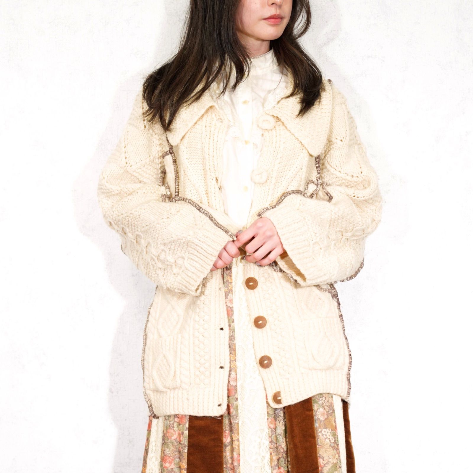 EU VINTAGE COLLAR DESIGN PATCHWORK REMAKE CABLE KNIT CARDIGAN|ヨーロッパ古着襟付きデザインパッチワークリメイクケーブルニットカーディガン ニットジャケット フィッシャーマンセーター|アランニット