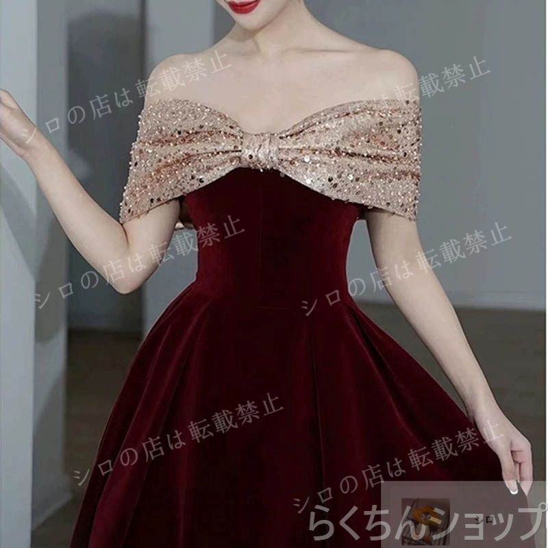 ♥ 2025 カラードレス パーティードレス Aライン 赤 レッド オフショルダー ベルベット ゴールド袖 演奏会 発表会 ウェディ