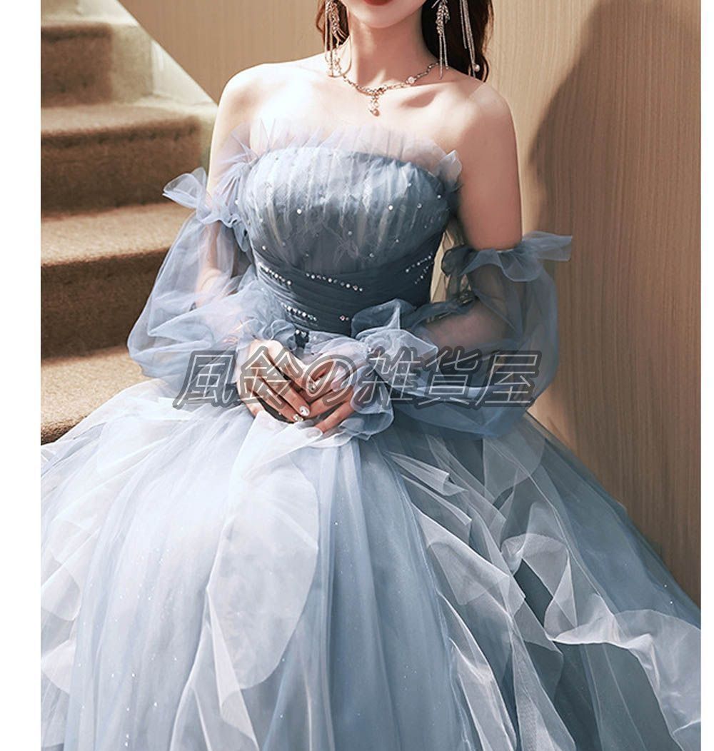 ♥ カラードレス プリンセスライン 青 ブルー パフスリーブ 長袖上品 ロングドレス ウェディングドレス 結婚式 二次会 花嫁 前撮り 演奏会 発表会 ステージ衣装 シフォン ふわふわ
