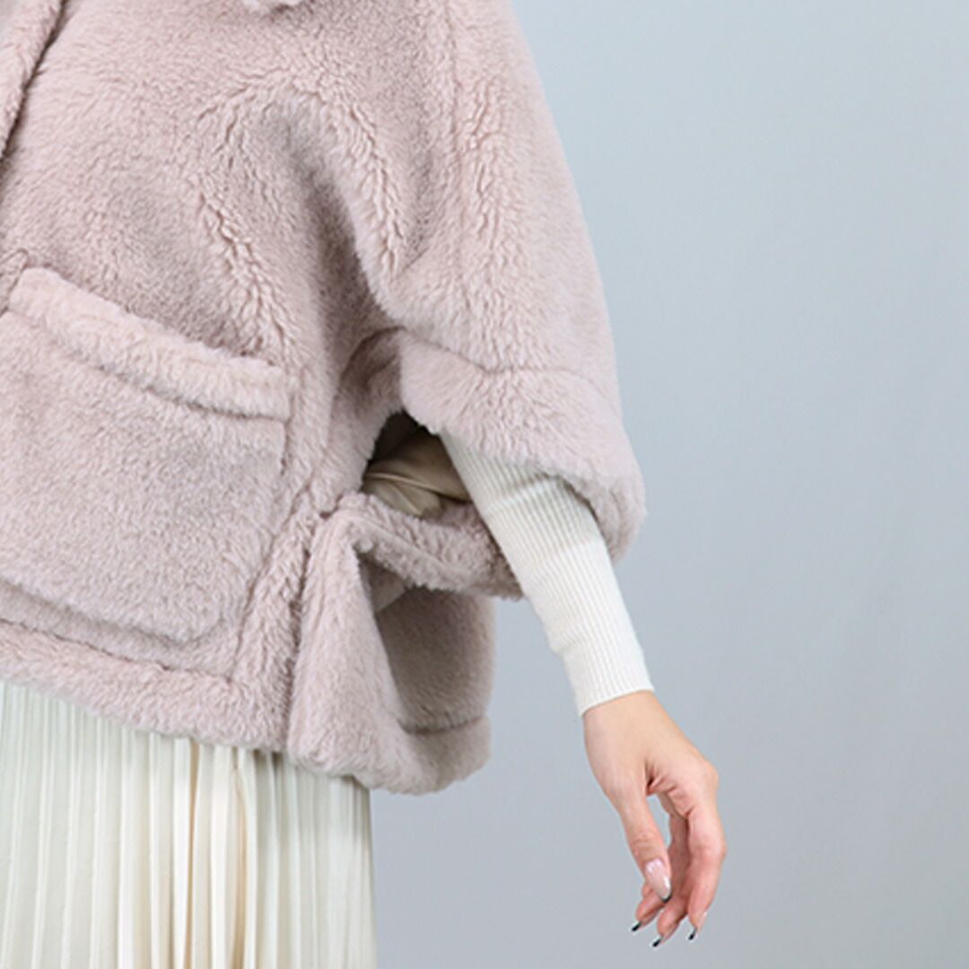 マックスマーラのテディベアコートと同じふっくらとした風合いのケープ。両サイドのボタンは外す事が出来、気分に合わせてシルエットをチェンジ出来る優れもの。上質なアルパカを使用し保温性もあり、羽織るだけで決まるおすすめの1枚です。