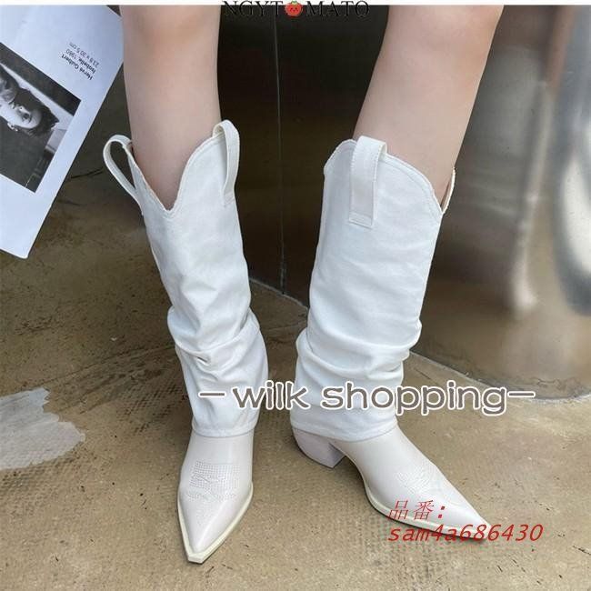ロングブーツ レディース ウエスタンブーツ デニムブーツ おしゃれ ローヒール コーンヒール ポインテッドトゥ ホワイト 履きやすい 歩きやすい カコイイ am 4 a 686430